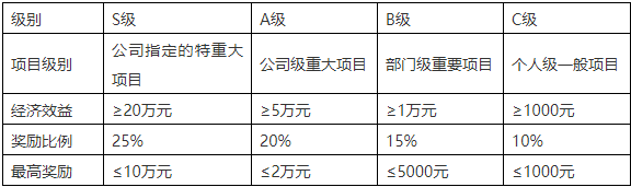 公司推行項(xiàng)目改善從質(zhì)量、成本、生產(chǎn)、交付、安全、設(shè)備改進(jìn)、團(tuán)隊(duì)及技術(shù)改善類等方面推進(jìn),不斷完善制度流程化建設(shè),同時(shí)建立獎(jiǎng)勵(lì)機(jī)制,按改善項(xiàng)目重要等級(jí)分S級(jí)、A級(jí)、B級(jí)、C級(jí),按級(jí)別比例進(jìn)行最高獎(jiǎng)勵(lì)。