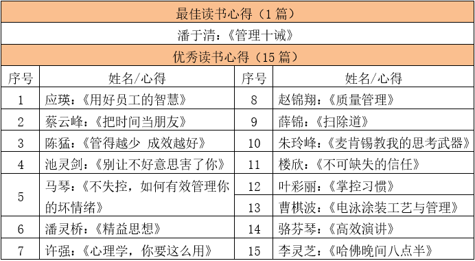 本次為2019年第三季度讀書心得評選活動(dòng),經(jīng)總裁辦校對、審核,從100多篇心得中初選出30篇,再根據(jù)主題明確、立意新穎、結(jié)合工作實(shí)際、文字通順完整等篩選出16篇優(yōu)秀心得,其中獲得本季度“最佳讀書心得”得主品質(zhì)部潘于清的《管理十誡》評選。最佳及優(yōu)秀文稿如下: